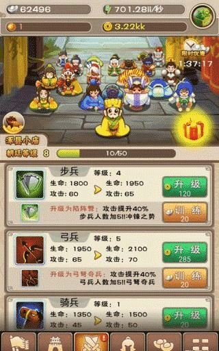 快速积累金币:教学引导结束后,我们就正式进入游戏环节了。首个目标是“下阫”。不过在此之前,得先提升自身实力,训练军队是关键。能看到,军队升级只需要一种资源——金币,那金币该如何获取呢?这款游戏的金币获取途径十分丰富,而且都很简单,就算是免费玩家也能快速攒到金币!接下来给大家推荐三种不同的获取路线,适配各类玩家的需求。