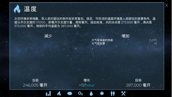 星球的各项属性并非彼此孤立,而是存在相互影响的关联:没有气压的星球难以留存温度与氧气,温度不稳定的星球其海平面也往往变幻莫测。请合理规划各类设施的运行,将各项属性都调节至最佳状态。建议优先确保温度与气压的稳定。