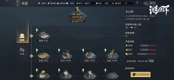 前期对石料的需求比较大,主公可以在有限的领地范围内多占据一些高等级的石料点。另外,也能借助建设功能,把已有的石料点升级成采石场,以此提升石料的产出量。