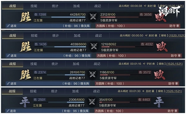 图中前两份战斗记录,是我方武将直接面对敌方主帅时产生的,后两份则是我方武将未与敌方主帅正面交锋的结果。对比可见,让我方两名武将与敌方主帅正面抗衡,能使部队损失降低近一半,这充分体现了武将对位安排的关键作用。若主公攻占单个地块的兵力损耗,等同于其他主公拿下两个地块的损耗,那么自身的发展节奏将会受到显著影响。