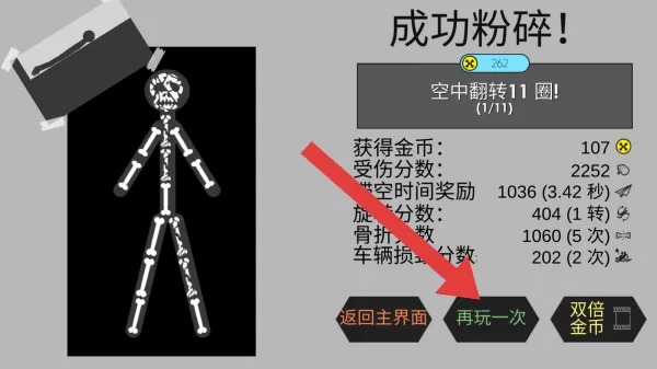 3、显示成功粉碎!达成空中翻转11圈成就,有返回主界面、再玩一次、双倍金币的按钮,用于选择后续操作。