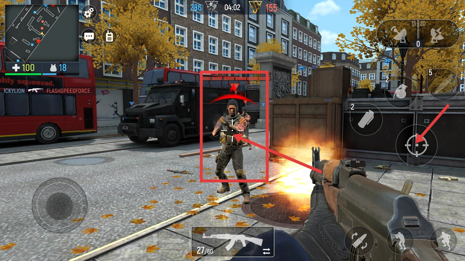 遇敌时对准敌人身体部位,点击射击按钮开枪,借助【AK-47】的火力进行压制,在城市街道里精准攻击敌人。