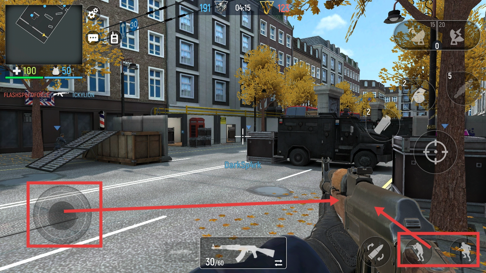 战斗时通过左侧摇杆操控角色移动,右侧按钮负责射击与转向,借助【AK-47-30/60】的弹药储备,在城市场景里灵活变换位置展开战斗。