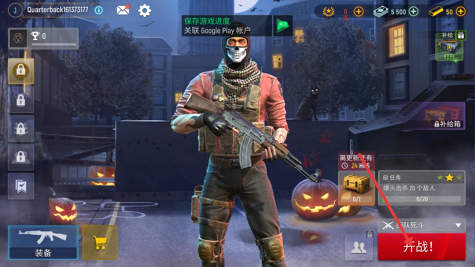 进入游戏后,先查看【任务-爆头击杀20个敌人】,熟悉【装备】界面,然后点击【开战!】进入战斗。