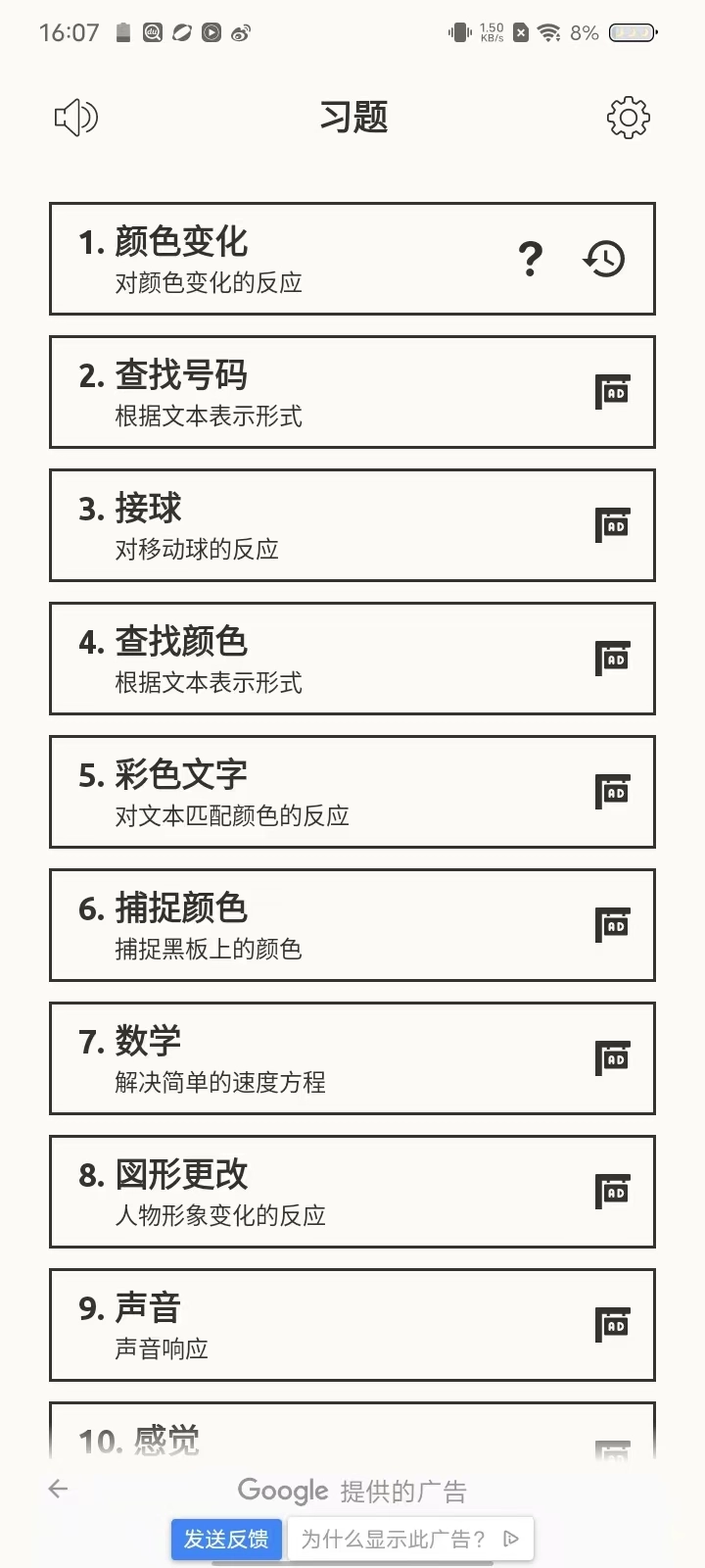 进入后,会出现不少练习类目,不过只有完成当前关卡,才能解锁下一个关卡。