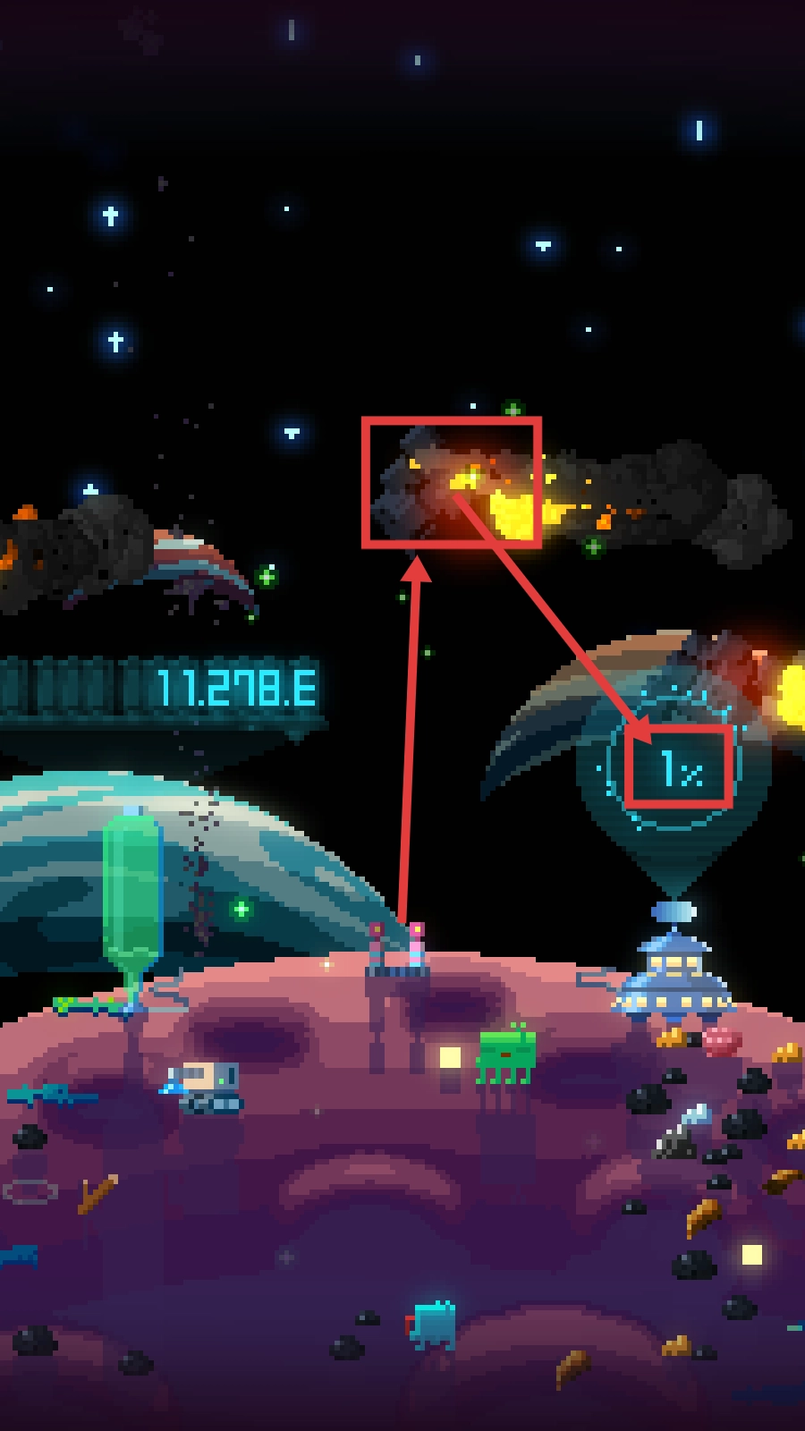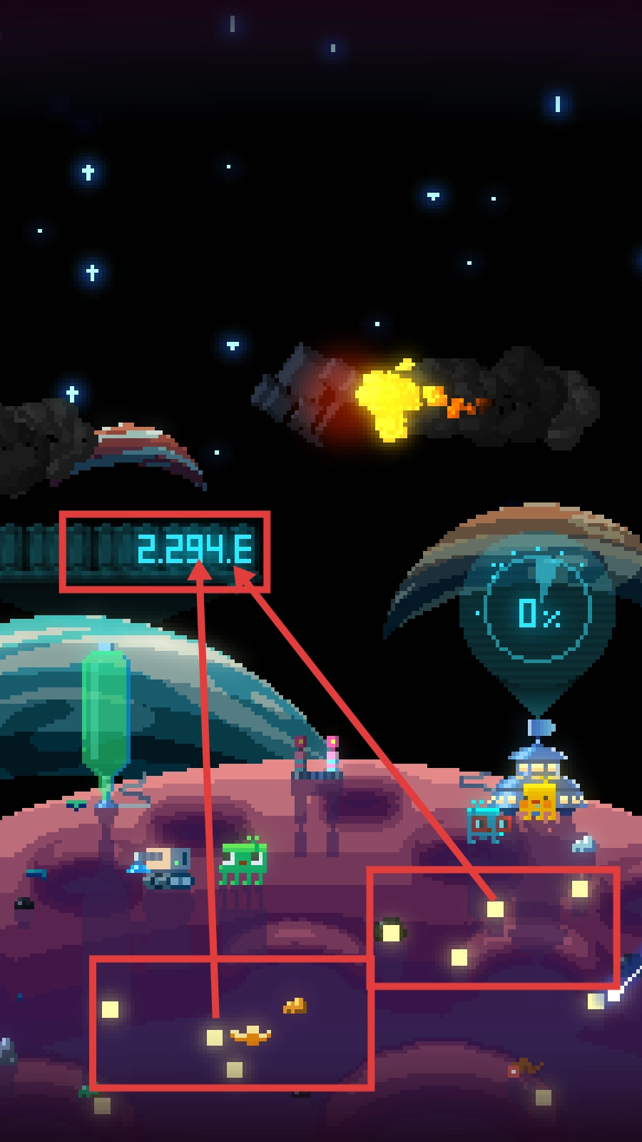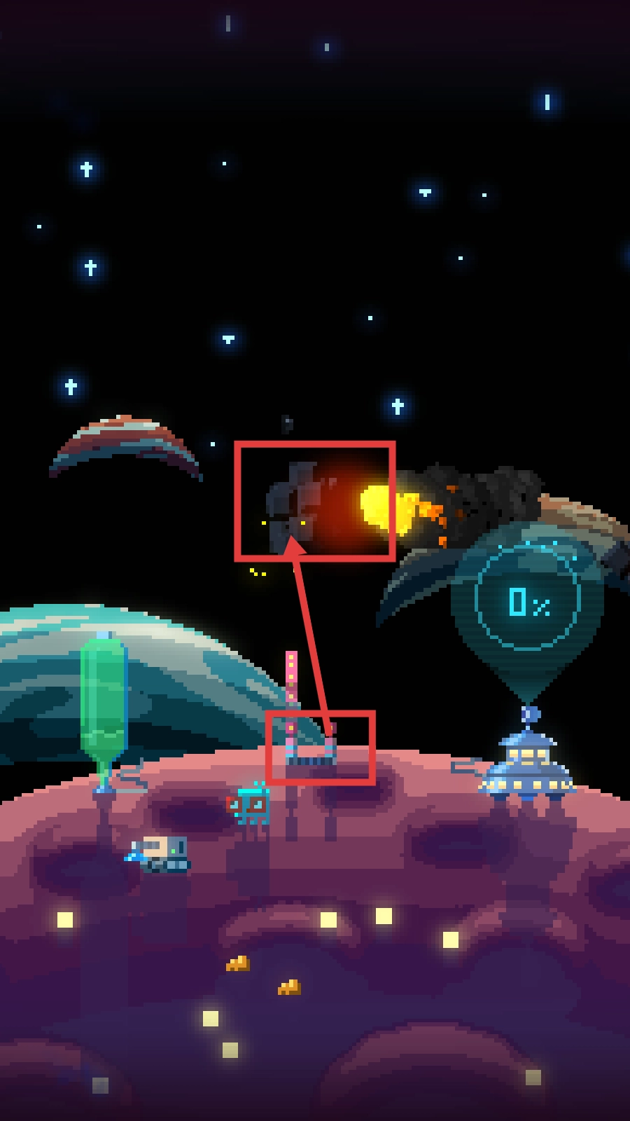 像素场景里藏着不少细节巧思,彗星分解时的粒子效果、火箭发射的光影轨迹、星球复苏时的植被蔓延,这些元素让简约的画风呈现出丰富的视觉层次。