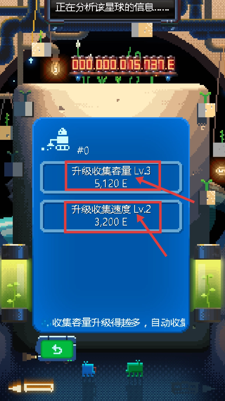 在升级界面,建议优先提升收集容量(例如升级到Lv.3,需消耗5,120E)与收集速度(例如升级到Lv.2,需消耗3,200E),以此提高资源获取的效率,为后续的探索活动奠定基础。