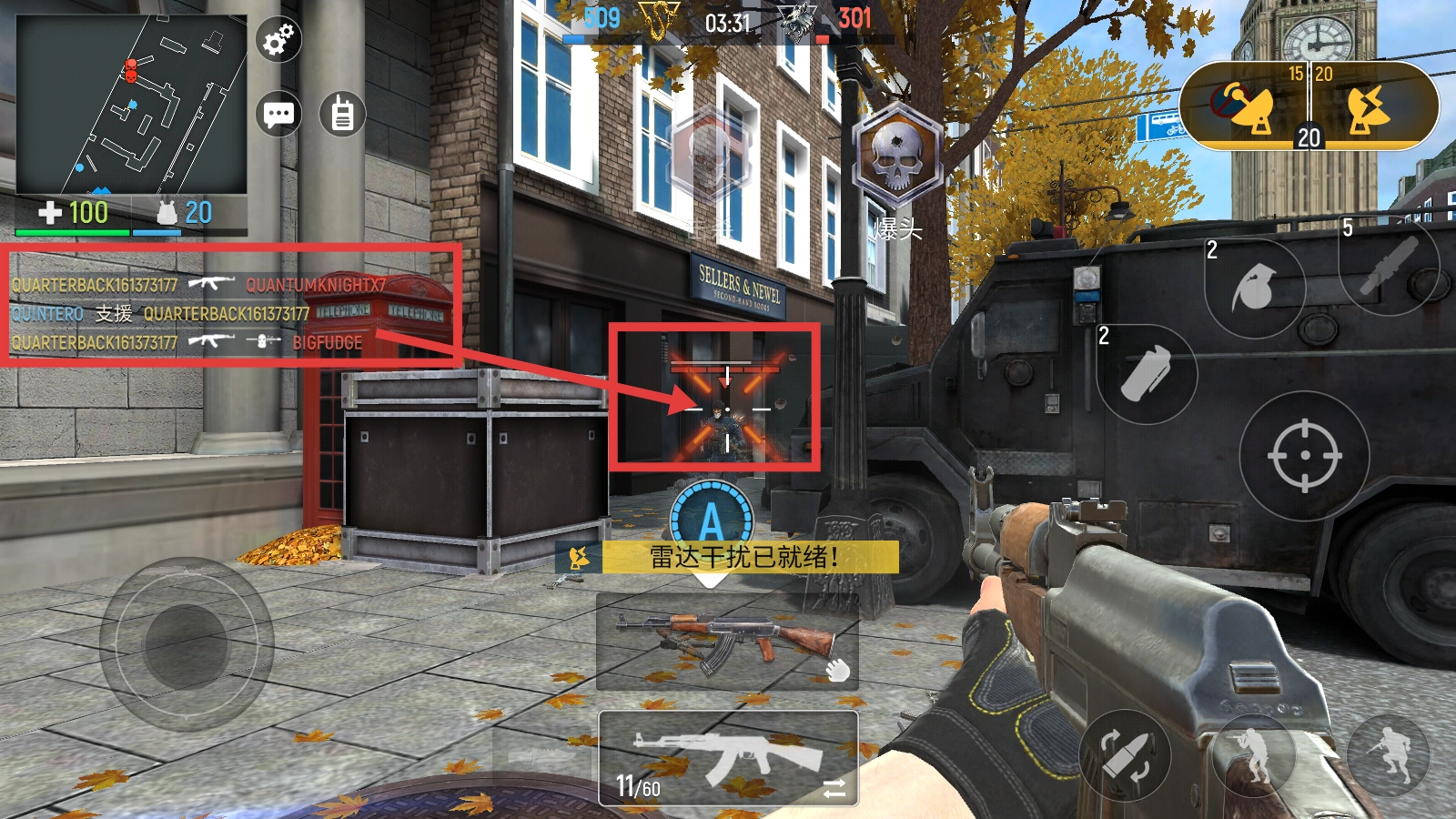 留意团队支援动态,运用【雷达干扰】技能,协同队友攻击敌人,提高战绩,积攒战斗优势。