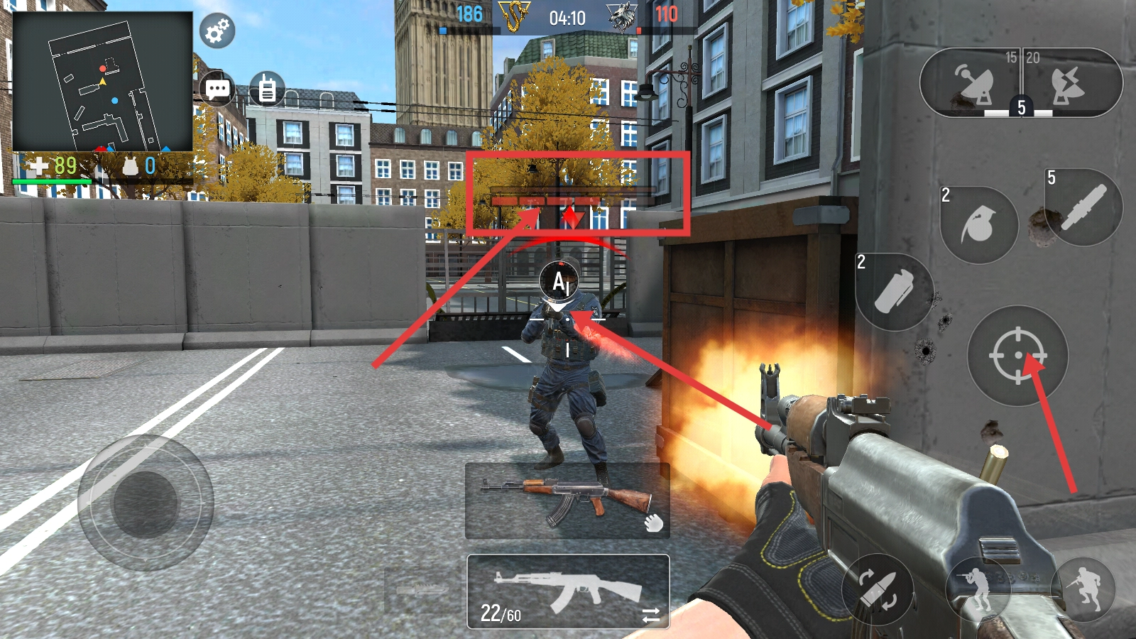 遇敌时锁定敌人,按下射击键开火,借助【AK-47】的火力进行压制,留意弹药【22/60】的消耗情况。
