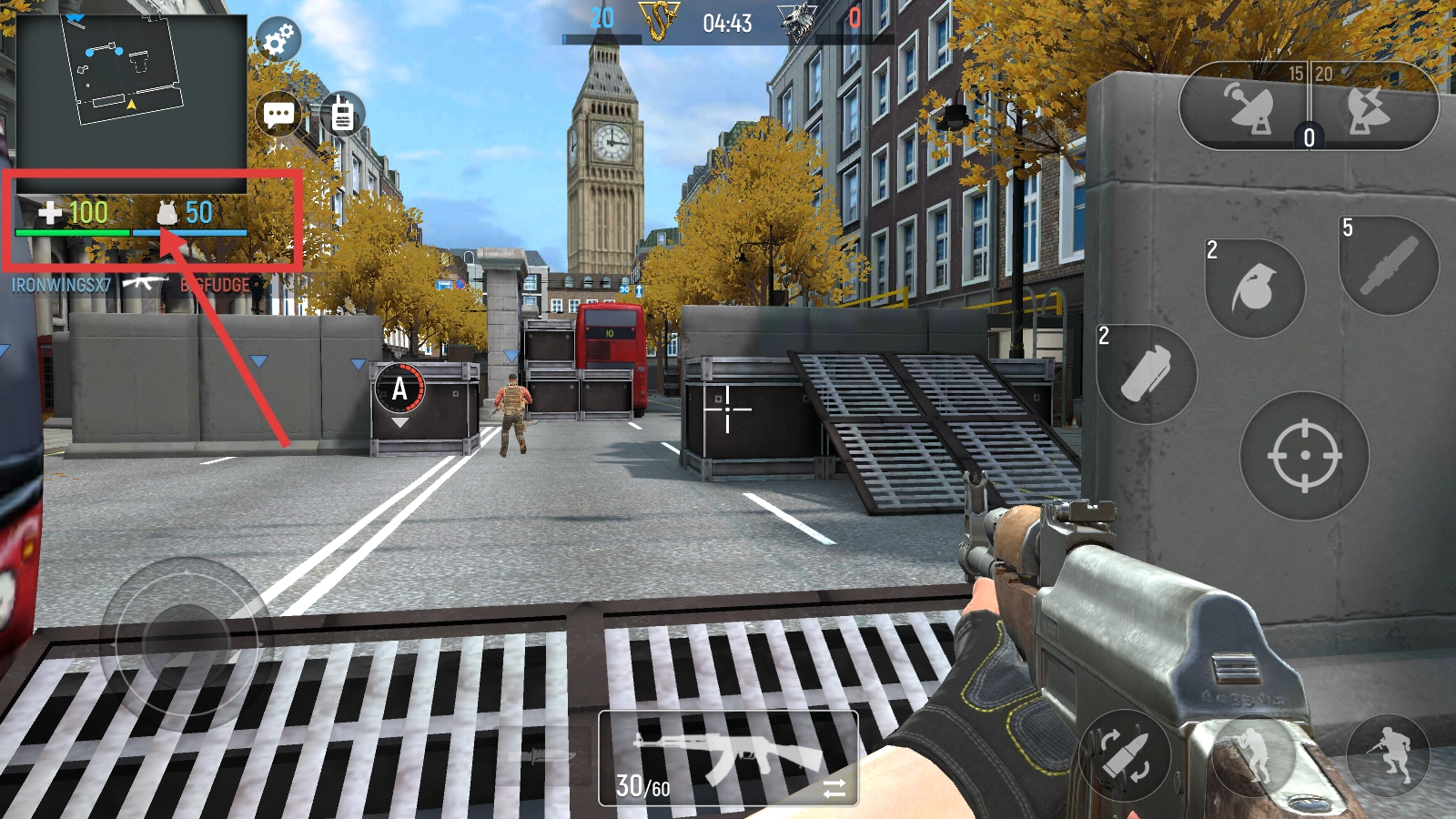 战斗时需留意【生命值增加100且护甲减少50】的状态变化,使用AK-47在城市场景中灵活移动,兼顾生存能力与攻击输出。