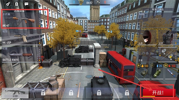 挑选【主武器-AK-47】,确定装备好之后点击【开战!】,就能进入城市场景展开战斗。