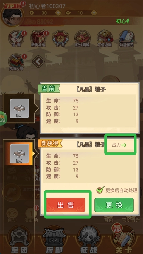 2、获取到低阶装备,直接出售。