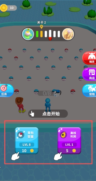 在进入关卡2之前,建议优先升级“背包容量”以提高收集上限,之后再升级“离线利润”来积累资源。