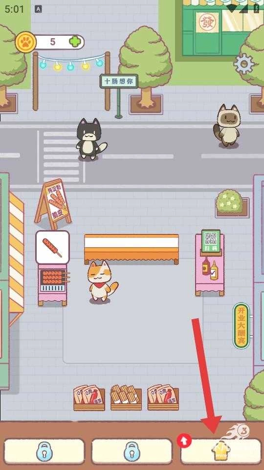 进入游戏界面后,首先留意红框里显示的金币数量【6】,然后点击红箭头所指的【烤肠摊位】