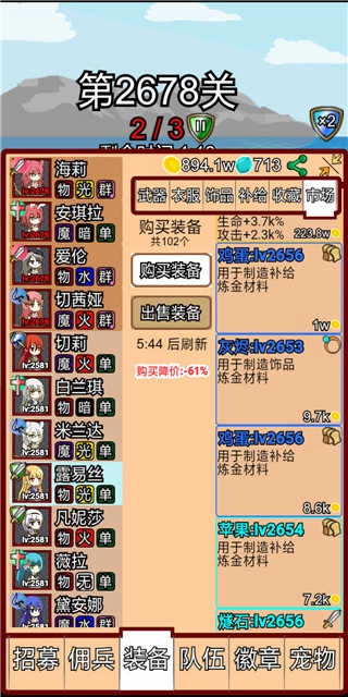 克莉丝、爱伦(375层的),或者两个能加装备掉率、会讲价的(825层的)也行。得先等商店折扣到70%以上才行,转生后商店会刷新,这个折扣只要时间够就能一直用。60或者70层就可以转生了,转生后去商店选补给类,把补给类全买了,绿色的就别买了。之后炼金也选补给类合成,其他三类随便混合合成就行。另外自动升级别开,没钱的话就卖到罕见级。合成神圣、神赐的时候最好看广告看结果,不然合成出奇怪的东西怕自己接受不了。我转生1200次了也没见过20星的宠物,全套神赐更没有,只有三件神赐异变。1800级的角色加上+7装备能秒3300级的怪。