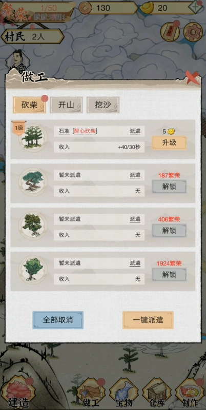 如果玩家在线时长较短、时间有限,可以优先提升居民在砍树、挖沙这类活动上的增益效果。这类活动支持挂机操作,即便不实时操作也能获取收益,很适合佛系玩家——不用时刻守着游戏,也能稳定积累资源收益。