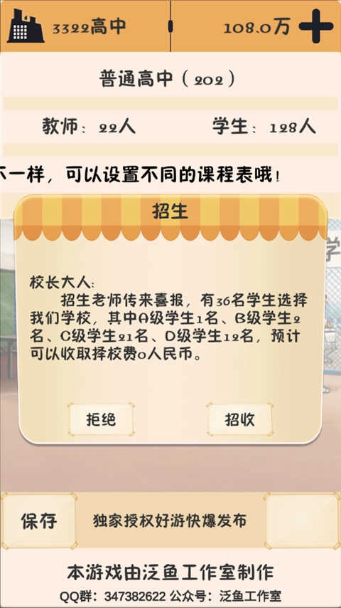 在游戏里,你得去提升师资水平,用心培养学生。只有学生们考出好成绩,能进入理想的大学,你的学校才能变得更有名气。