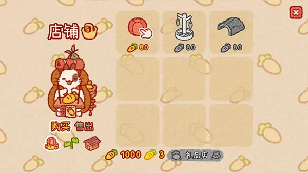 3、右下角,蓝色框里的萝卜是货币,可以用于兑换装饰和建筑;绿色框里的萝卜是食物,可以喂食兔子们,获取亲密度。