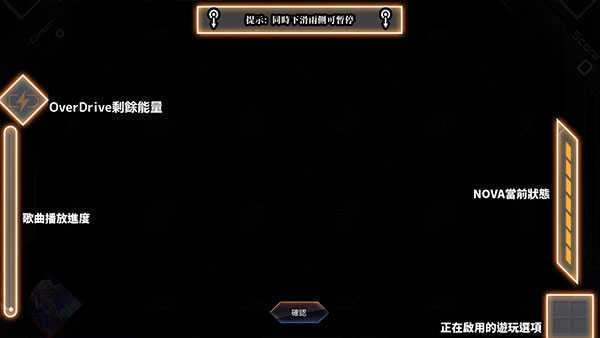 画面左侧显示着歌曲的播放速度以及OverDrive的剩余能量,右侧呈现的则是NOVA的当前状态。