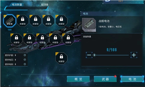 电池就好比舰船的护盾,配备更高级、数量更多的电池能够增加舰船的血量(在PVE模式下,每艘船会自动被装满电池)