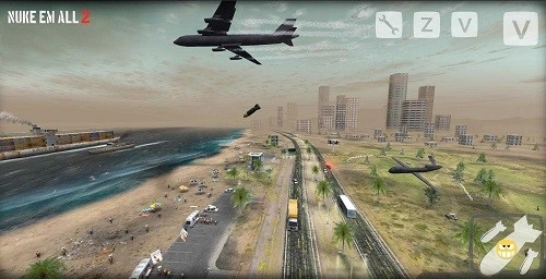 左上方显示的是当前得分,右上方则标注着核弹的类型与剩余数量,点击此处能够切换不同种类的核弹。完成任务的条件很简单,只要把地面上的所有目标全部清除就可以了。