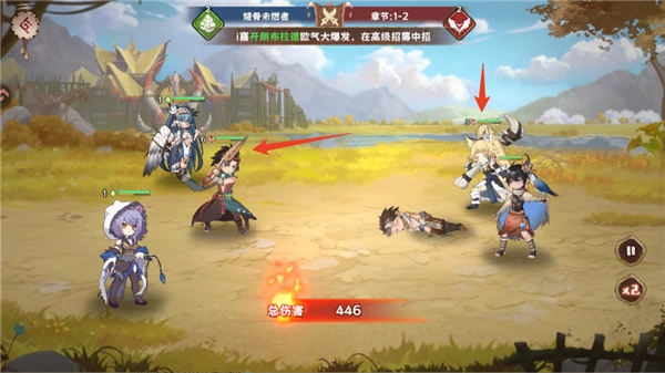 我们的角色位于右侧,绿色的是生命值条,黄色的是怒气值条;生命值条耗尽时角色会退场,怒气值条充满后就能释放大招!