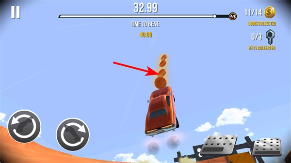 在车辆腾空跃起的瞬间瞄准空中悬浮的金币,通过收集这些金币能够有效提升关卡的最终评分,这是游戏中积累资源的关键核心操作;收集过程中,需要精准把握车辆的跳跃轨迹与金币的排列布局,才能顺利完成收集。