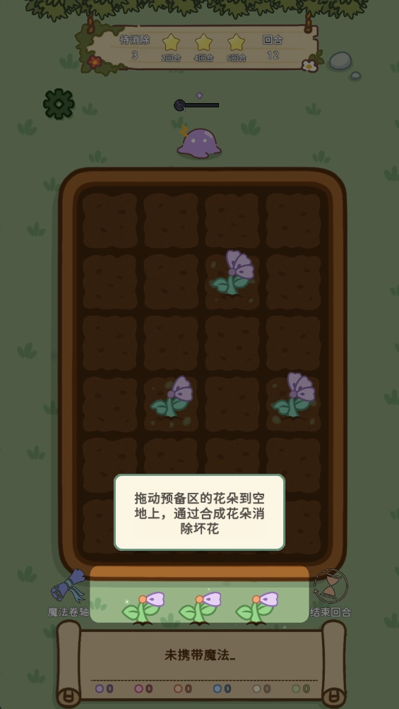 游戏开始时会有新手引导,把预备区的花朵拖到空地上,借助合成花朵来清除坏花。