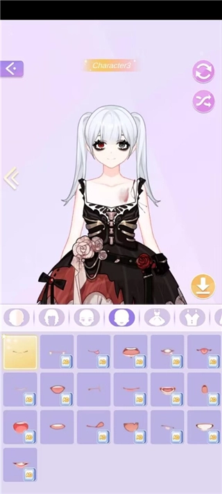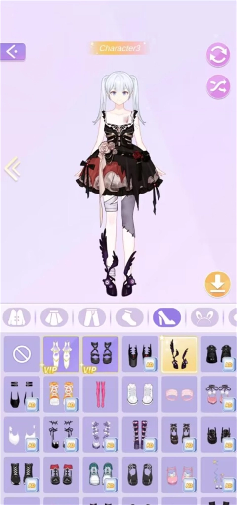 首先我们需要搭配人物,点击装扮选项,其中包含服装、裙子、鞋子等内容。