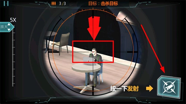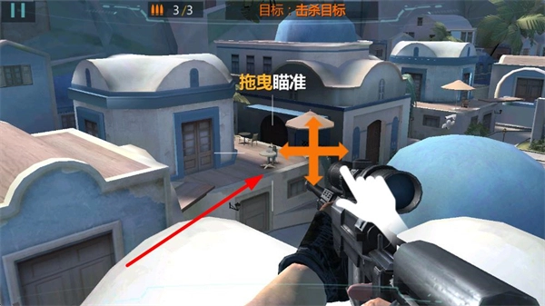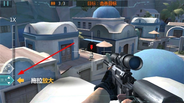 拖动屏幕来调整狙击枪的瞄准方向,搜寻目标的位置,在瞄准的时候要耐住性子,认真观察场景里的每一处细节。