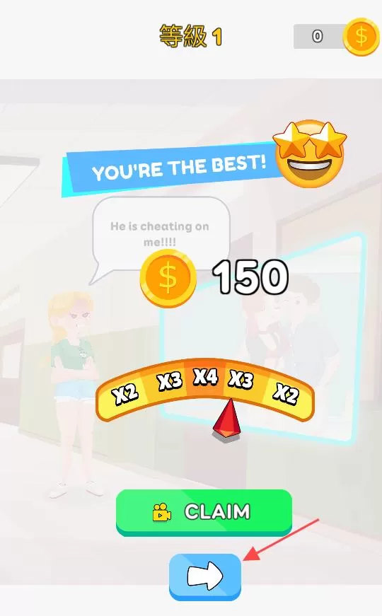3、线索集齐后,触发结算界面,确认男生出轨事实,收获金币奖励,借界面功能,择继续挑战或查看奖励,完成该关卡侦查。