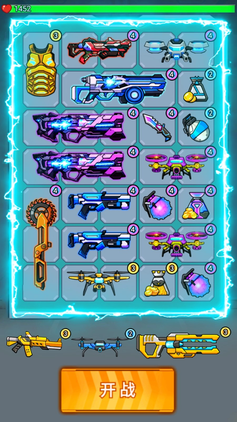进入游戏后点击“开始”按钮,把武器拖拽到指定的格子里,相同的武器能够合成并升级,等装备安置完毕,就可以正式开启对战了。