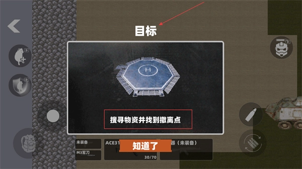 开始挑战后,首先要确认目标是搜寻物资并找到撤离点,接着点击【知道了】关闭提示,这样就能进入战斗场景了。