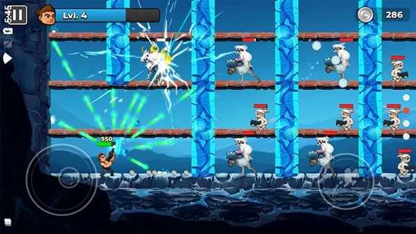 两个木板平台之间能够借助左侧轮盘的上下键实现相互跳跃,当靠近敌人时会自动进行射击。