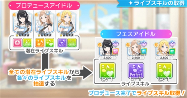 偶像可获得的现场技能,是从制片人偶像所拥有的“潜在现场技能”中抽选而来的。