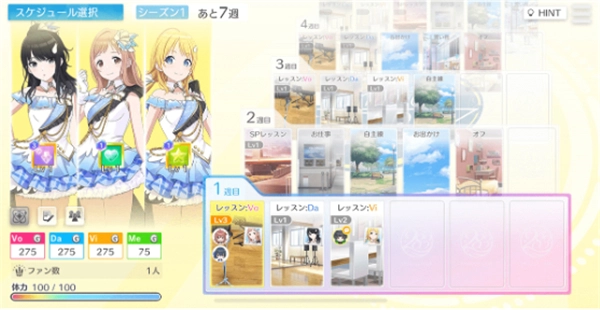日程安排里既有能学习制作卡片的课程,也有可提升状态的自主训练,包含了各种各样角色的相关日程内容。