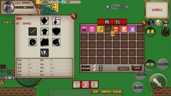点击右侧背包及人物按钮,分别可以看到背包以及人物装备、属性