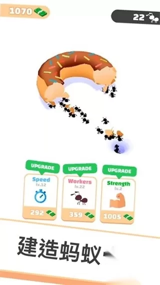 2、这时大家会看到蚂蚁们开始陆续搬运,如果觉得速度太慢,玩家可以点击下方使用金币召唤更强力的蚂蚁士兵。