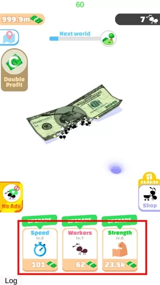 1、当大家进入小蚁帝国后,会看到蚂蚁需要搬运的物品,这些物品可能是食物,如下图所示的是钞票。