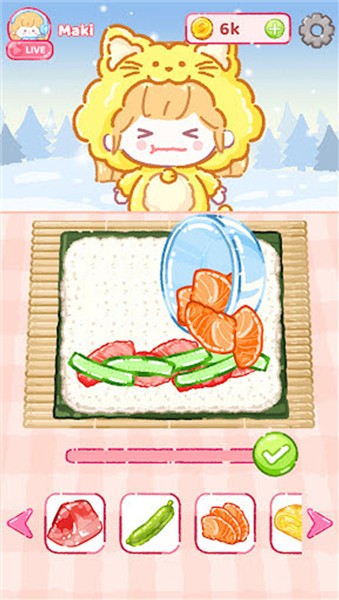 点击已解锁的各类食材,制作出一款心仪的寿司,后续的配方与食材获取需依靠金币和粉丝赞赏来解锁。