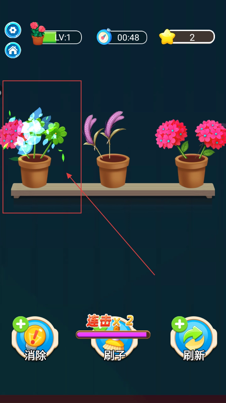 2、观察花盆花卉,将相同的花卉的拖动到同一个花盆,三个相同的花卉在同一个花盆时即可消除。