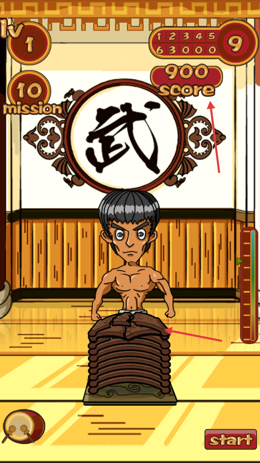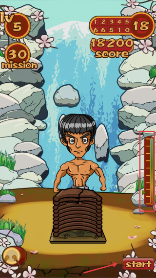 3、进入游戏后,我们可以留意右侧的力度条,等准备好后,点击【start】按钮开始劈砖。