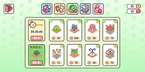 游戏内的红宝石资源较为稀缺,玩家主要通过观看广告和完成连续几日的每日登录任务来获取。此外,游戏中的服装、土地扩张、特定植物以及土地装饰等物品,均需使用红宝石进行购买。