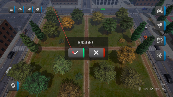 4、若场景混乱,点击左下角重置,选【√】确认,恢复初始场景重玩。
