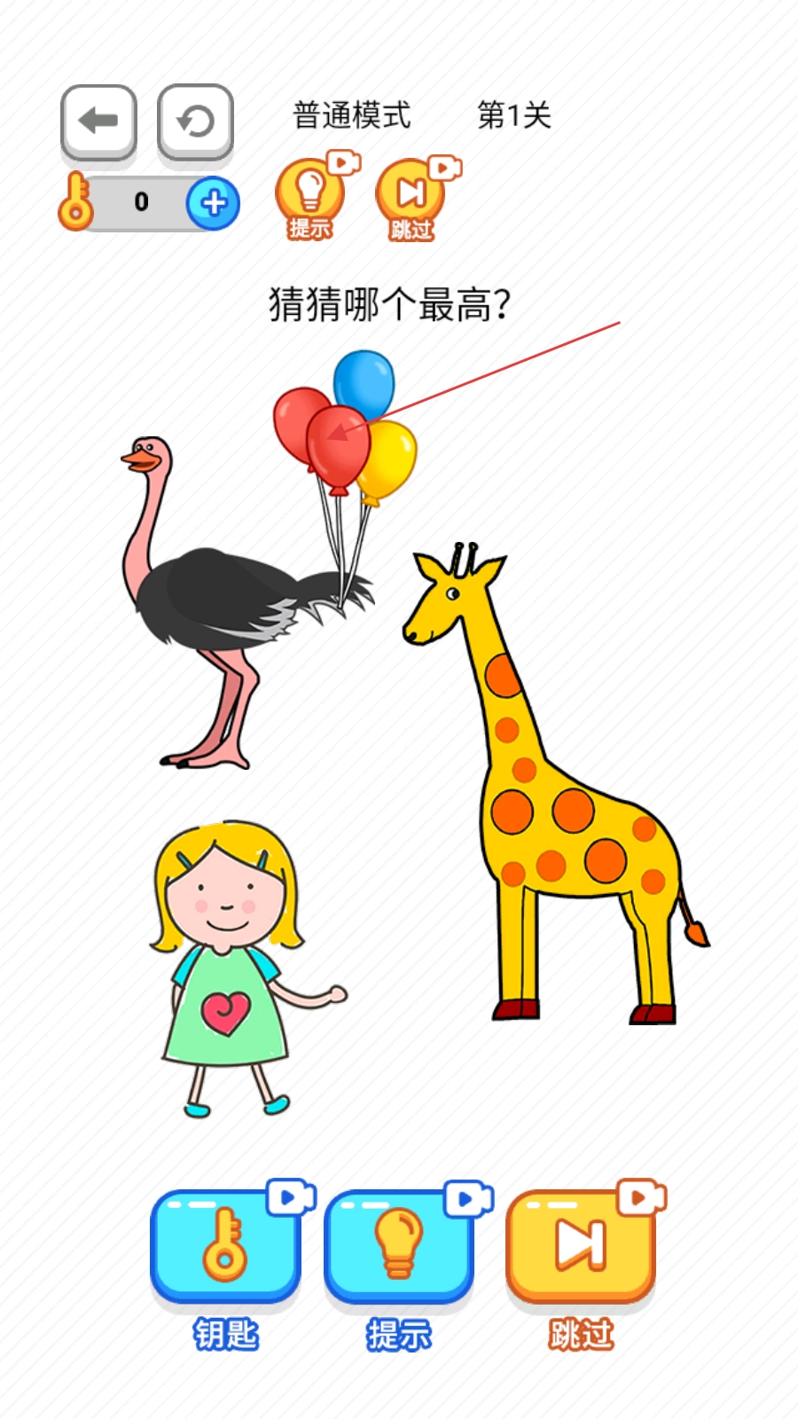 3、观察动物与人物,判断气球最高,点击气球完成关卡挑战。