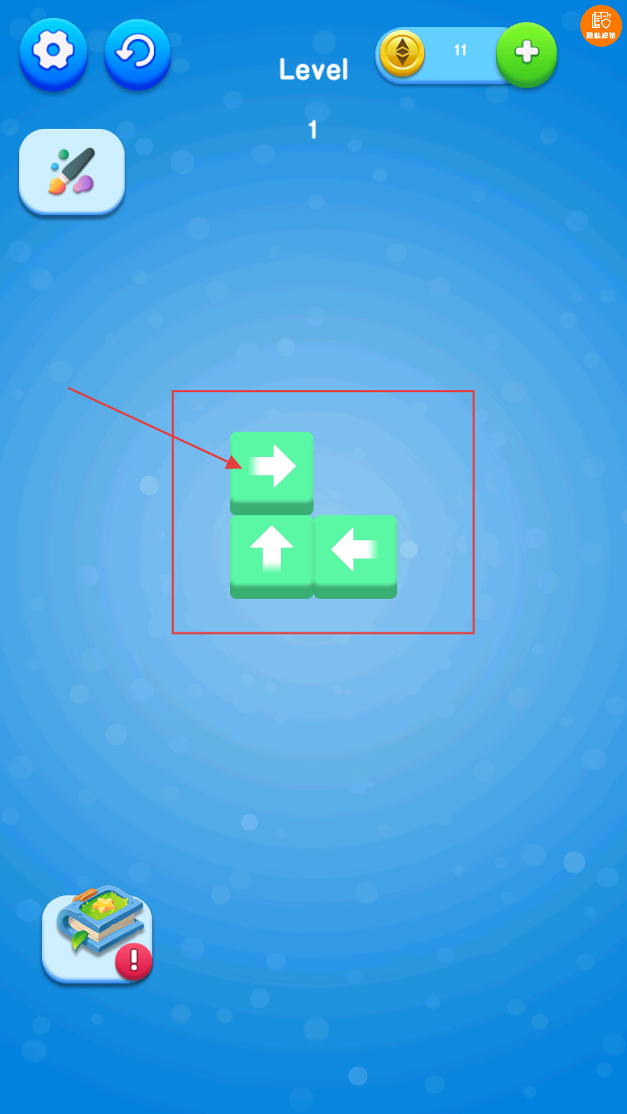 2、操作带箭头绿色方块,按指向移动,进行消除。