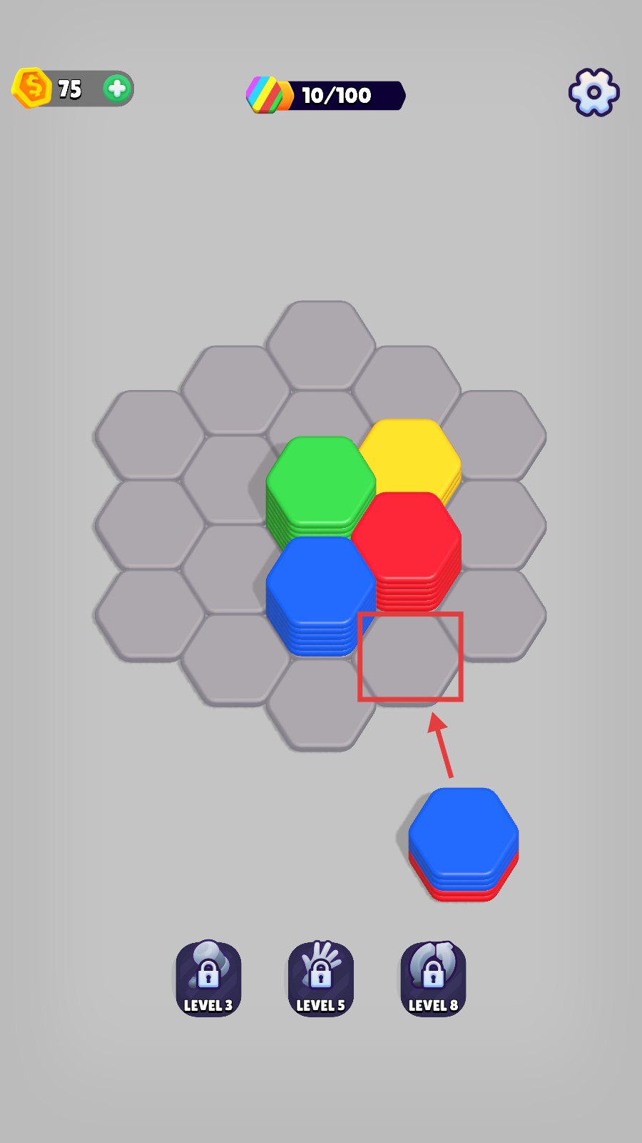 2、接着,我们选择下方的蓝色六边形块,将它放置到上方合适的灰色六边形空位处,让相同颜色的六边形块被附近收集。