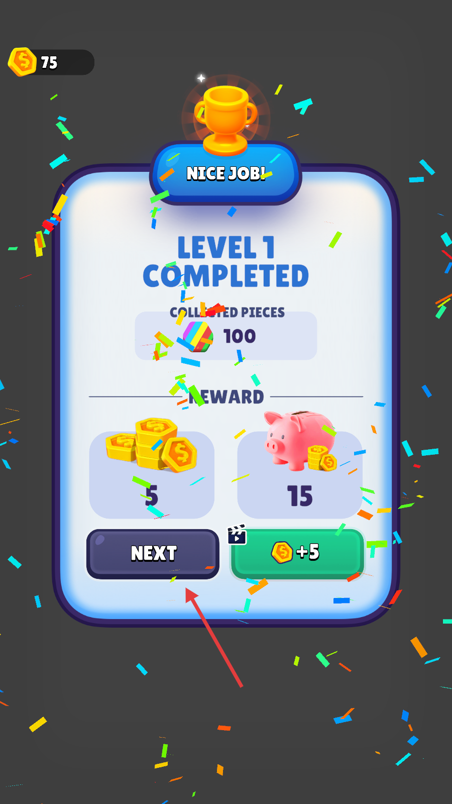 4、当关卡1完成后,我们会获得金币等奖励,此时点击【NEXT】按钮,就能进入下一个关卡,继续挑战啦。