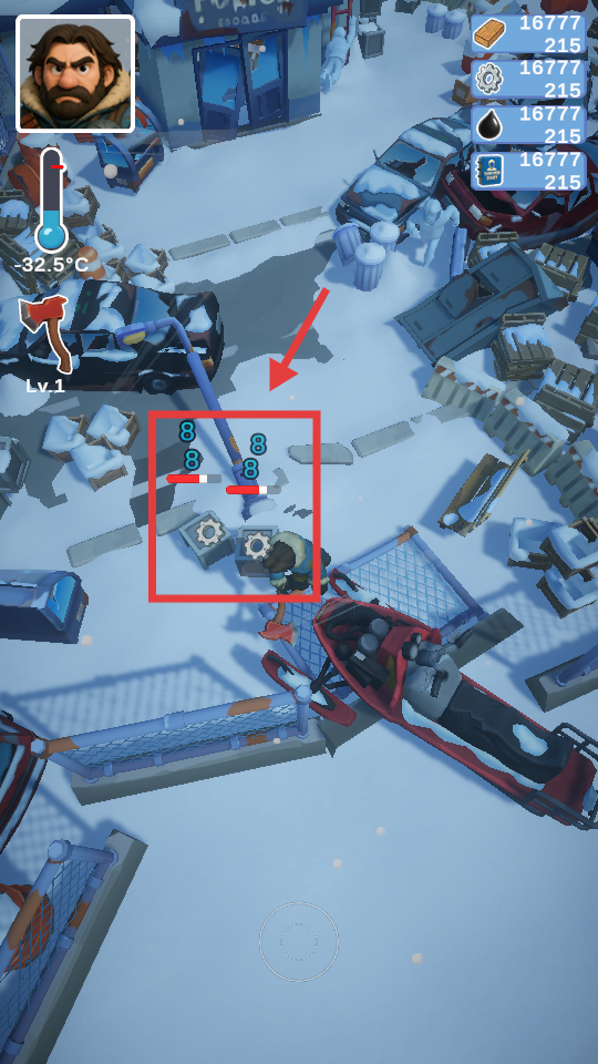 控制角色在雪地场景中移动,探寻周边的车辆、建筑等区域。