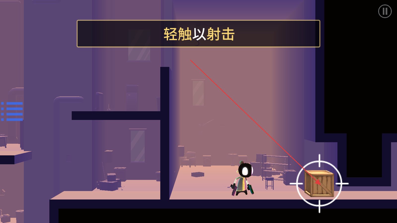 3、遇到木箱等目标,轻触屏幕射击,清除前进阻碍。